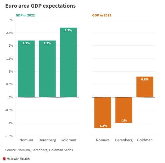 欧盟委员会本月早些时候表示,经济今年将增长2.7%,明年将增长1.5%。然而,该机构还表示,俄气供应的全面关闭可能会在2022年晚些时候导致经济衰退。