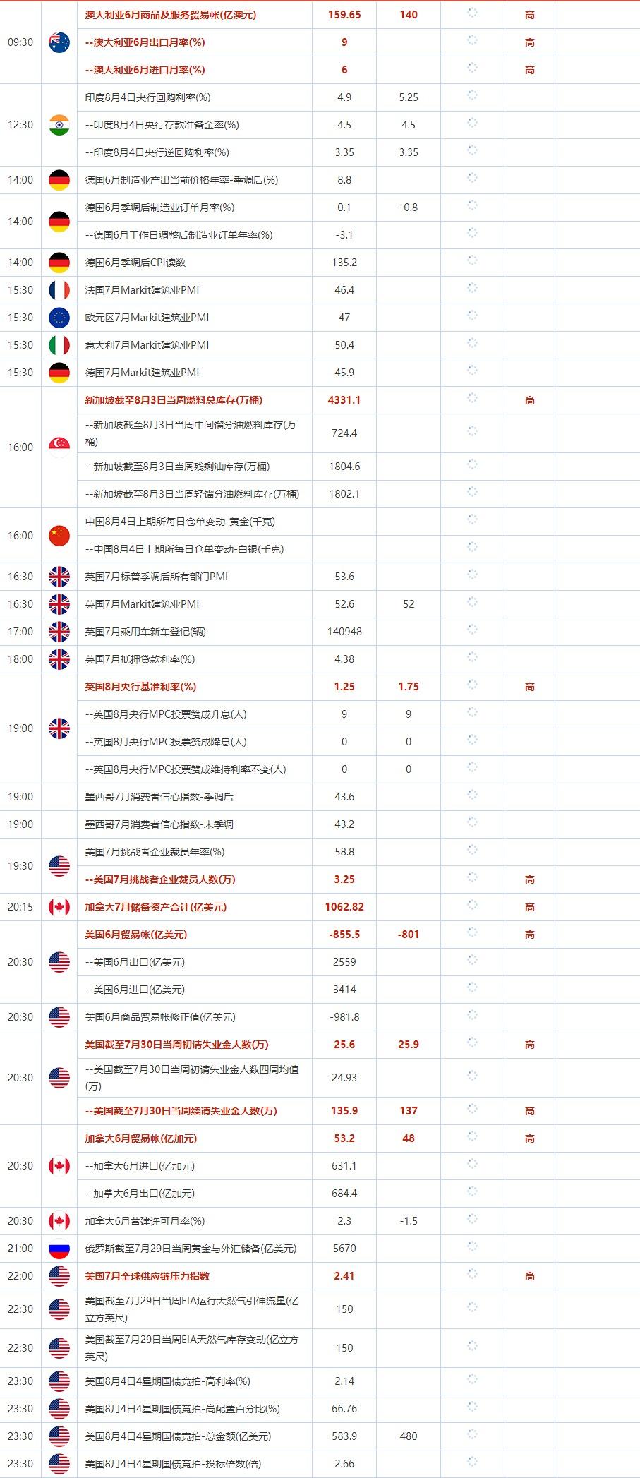 后续及时更新的财历数据请关注:【汇通网8月4日财经日历】