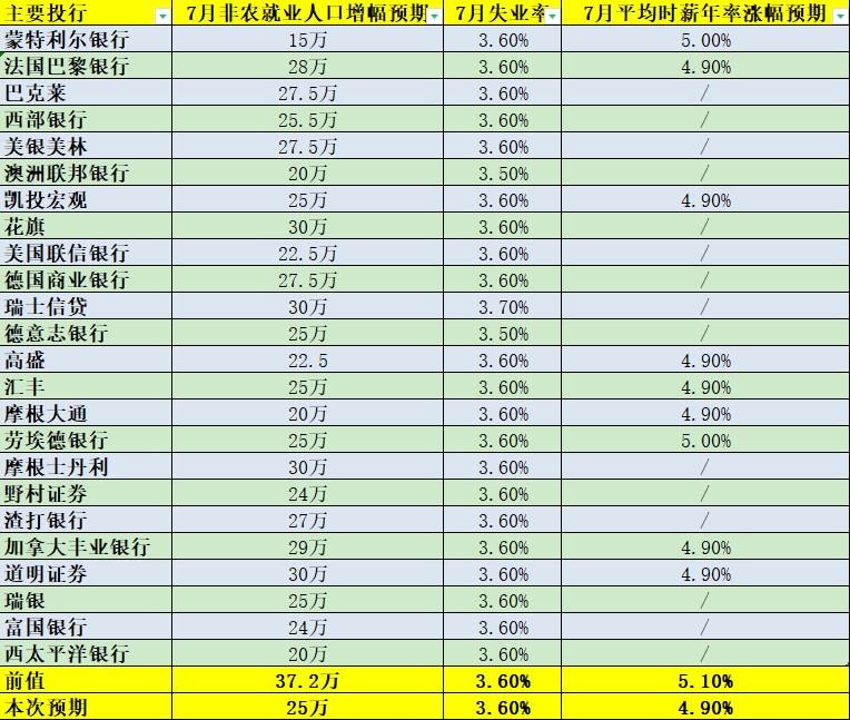 24家大型投行预测显示,主要投行认为7月非农增幅进一步下滑,但投行之间的增幅预期差距较大。具体而言,美国7月季调后非农就业人口增幅料介15万-30万(前值37.2万),失业率料介于3.5%-3.7%(前值3.6%),平均时薪年率增幅料介于4.9%-5.0%(前值5.1%)。