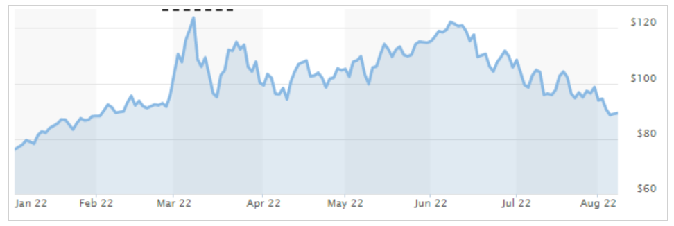 近几个月来,由于全球经济增长放缓,加剧了人们对能源使用量将下降的担忧,投资者纷纷撤出大宗商品。自6月中旬至今,WTI原油已经从123.68美元的高位一路下跌至89美元,近两个月内累计跌幅达到27%。