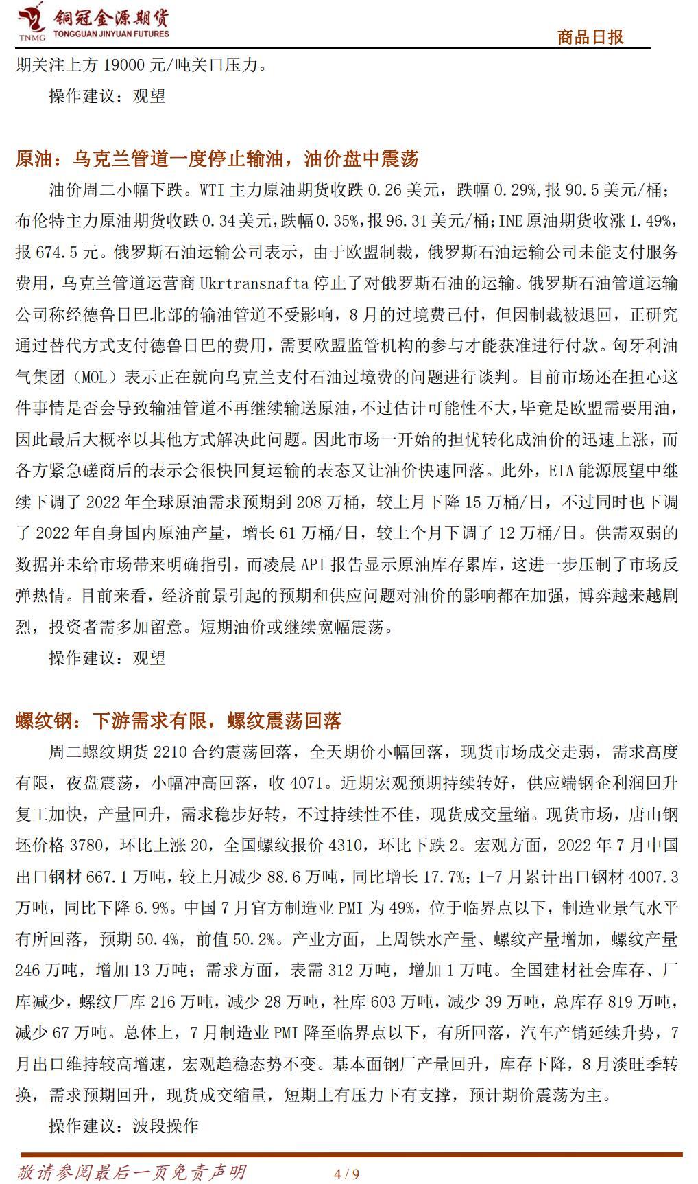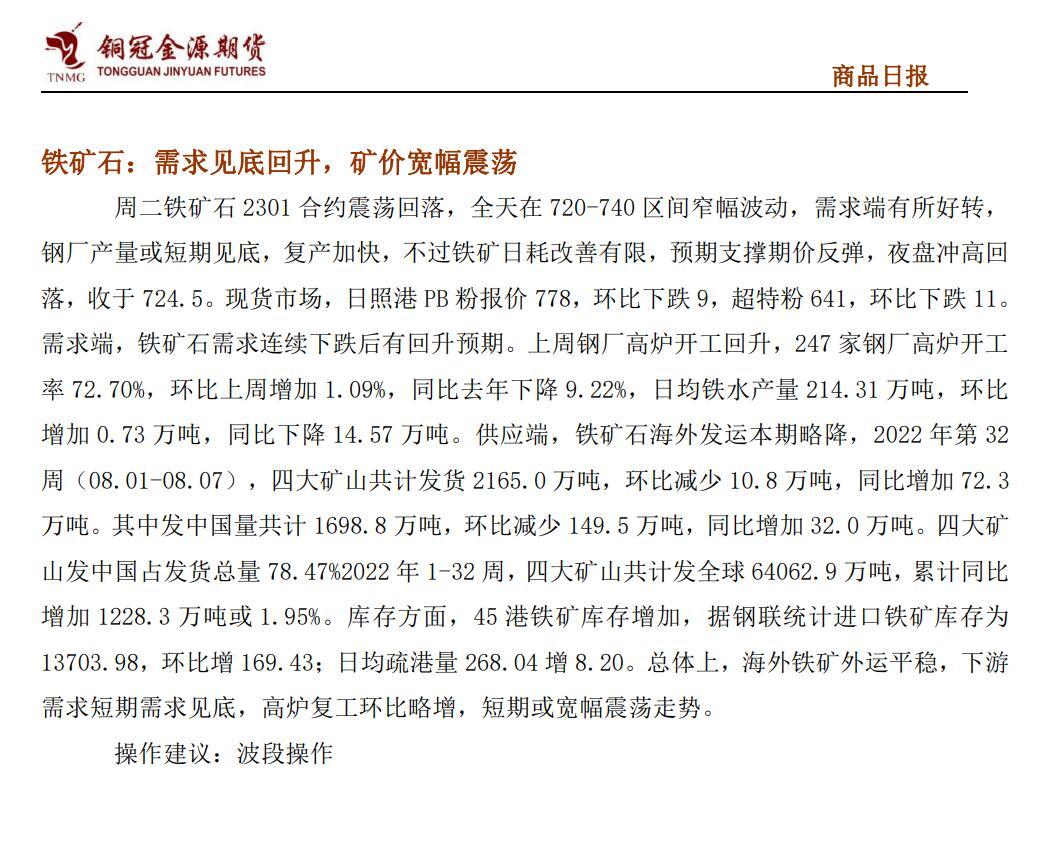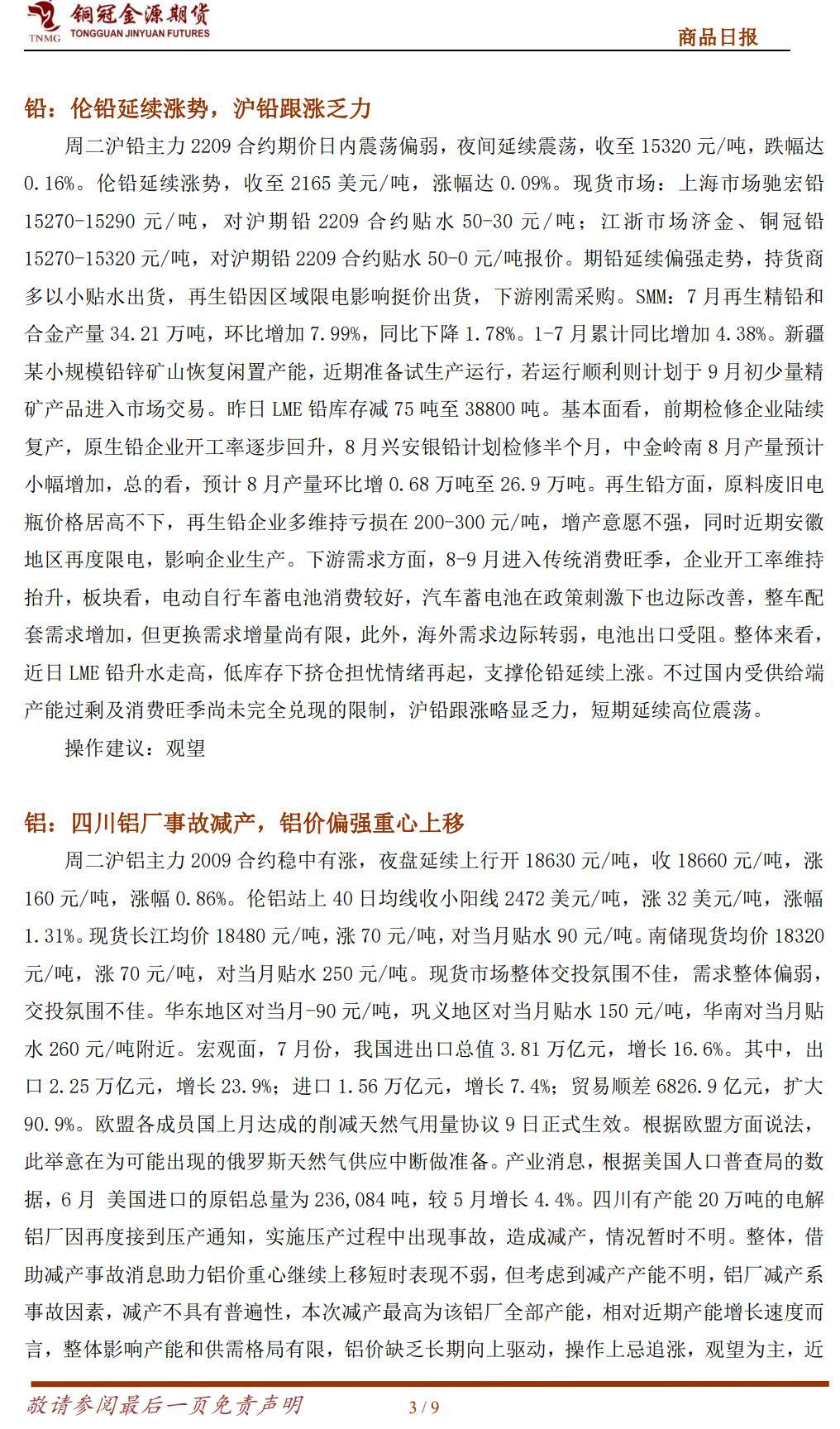 铜:供需继续改善,铜价维持反弹。周二沪铜 2209 合约震荡上行,最终收于 61220 元/吨;国际铜 2210 合约走势同样震荡上涨为主,最终收于 54370 元/吨。夜盘伦铜出现盘整,沪铜和国际铜跟随调整。周二上海电解铜现货对当月合约报于升水 110-升水 170 元/吨,均价 140 元/吨,较前一日下滑 85 元/吨,沪铜月差扩至 400 元/吨以上,现货升水下泄接近百元。宏观方面,重磅 CPI 发布前标普四连跌,芯片股重挫,2 年和 10 年期美债继续刷新二十多年最大倒挂程度;中国 7 月乘用车销量同比增 20%,创十年次高增速,电动车淡季承压环比下降 8.5%。行业方面,住友金属将智利 QB2 铜项目成本预估上调 60%。昨日铜价震荡回升,夜盘冲高之后回落,整体继续维持震荡回升走势。目前市场关注焦点在于周中美国通胀数据,可能会对后期加息预期有较大影响。但整体上看,9 月加息到来之前,宏观市场将继续处于平稳环境;而供需方面,供应端,粗铜紧张形势对于产量形成影响,而国内需求继续环比改善,下半年对于基建和地产的预期好转,也将支撑需求。因此我们认为短期铜价仍将延续反弹。