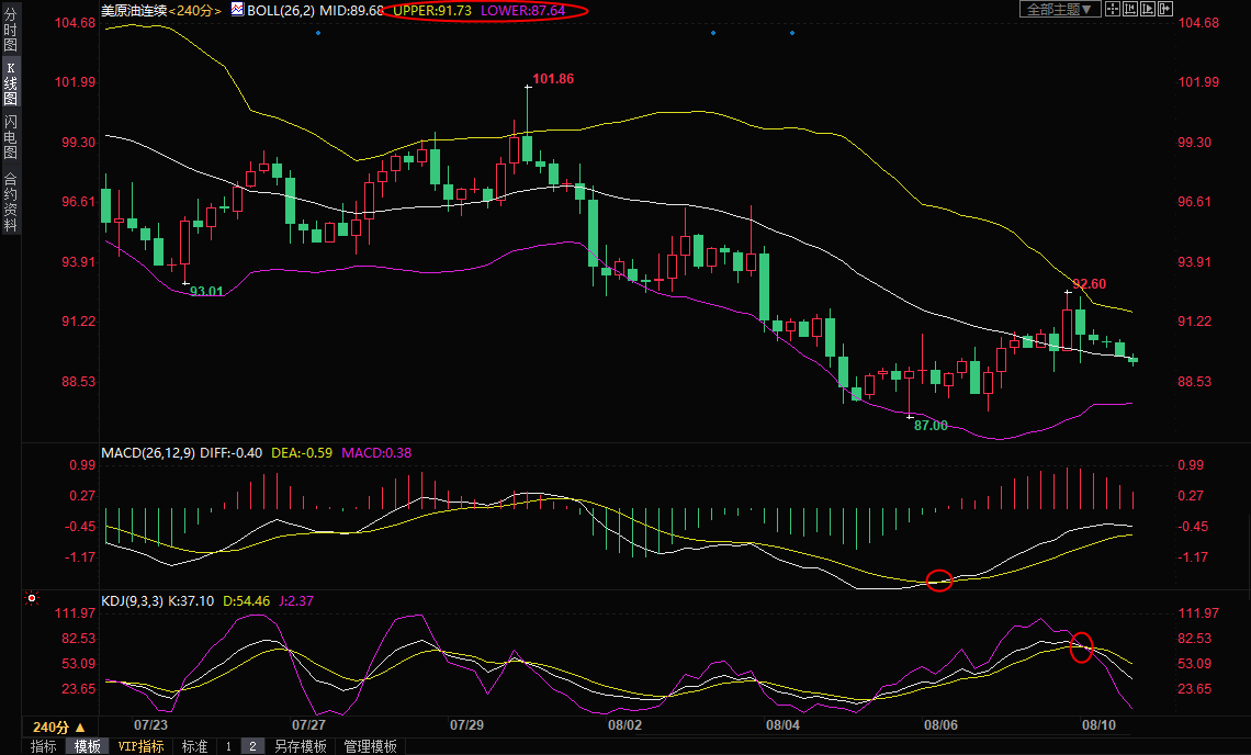 4小时级别:低位震荡;布林线轨道收口,留意布林线轨道87.64-91.74区域突破情况。该区域的突破可以为短线走势提供进一步指引。