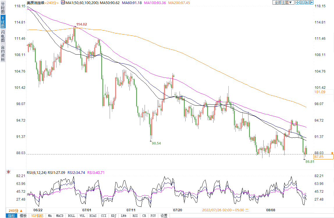 周一(8月15日)布油尾盘收跌近5%,报93.2美元/桶。早前中国国家统计局公布的数据显示,7月份全国规模以上工业增加值同比增长3.8%,比上月回落0.1个百分点。全国服务业生产指数同比增长0.6%,其中,信息传输、软件和信息技术服务业,金融业生产指数分别增长10.3%、4.9%。7月原油加工量为5321万吨,相当于1253万桶/日,是2020年3月以来的最低水平。民生银行首席经济学家温彬分析认为,7月经济整体延续恢复态势,特别是基建投资增速继续加快,发挥了托底作用,但整体来看,内需不足导致复苏基础尚不稳固。此前令人失望的经济数据再次引发对全球经济衰退的担忧,预计这将导致燃料需求减少。