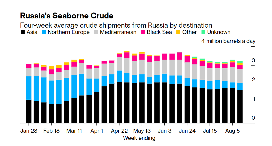 以四周移动平均数据来看,俄罗斯的海运原油出口量已稳定在比俄乌冲突后达到的峰值低约每天50万桶的水平,与冲突前的水平相比几乎没有变化。在此基础上,根据彭博社监测的船舶跟踪数据,截至8月12日的一周内,俄罗斯海运石油出口量小幅走低,从前一周的每天332万桶下滑至每天324桶。