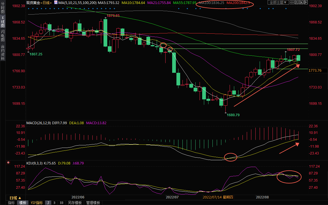 不过,KDJ高位死叉信号仍在延续,金价多个交易日未能有效上破1800关口,也需要提防重回跌势的风险,初步支撑在10日均线1784.68附近,然后8月8日低点支撑在1770.58附近,若失守该支撑,则增加短线看空信号。