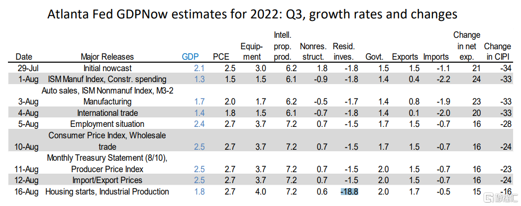 分析师指出没有迹象表明(至少没看到美联储官员)对房地产市场的金融风险表示担忧。住宅房地产价格持续上涨,委员们指出,尽管估值有所提高,但抵押贷款承销标准比之前的房价周期更强。早前亚特兰大联储GDPNow模型预计美国三季度GDP为1.8%,此前为2.5%。在美国7月新屋开工总数/营建许可总数公布后,亚特兰大联储将第三季度房地产投资的预期从-1.5%大幅下调至-18.8%。