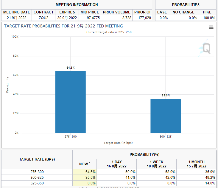 7月美国核心零售销售强于预期,该指标与国内生产总值(GDP)中的消费者支出部分最密切相关。同时,官方数据显示,英国7月消费者价格指数(CPI)同比涨幅升至10.1%,为1982年2月以来最高。这些数据似乎促使美国联邦基金利率期货的投资者将押注转向支持9月加息75基点。美国7月就业和薪资增长均超过预期,再加上最近股市反弹,可能表明经济对美联储来说仍然“过热”。