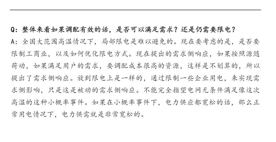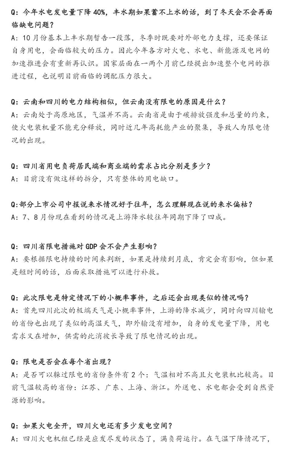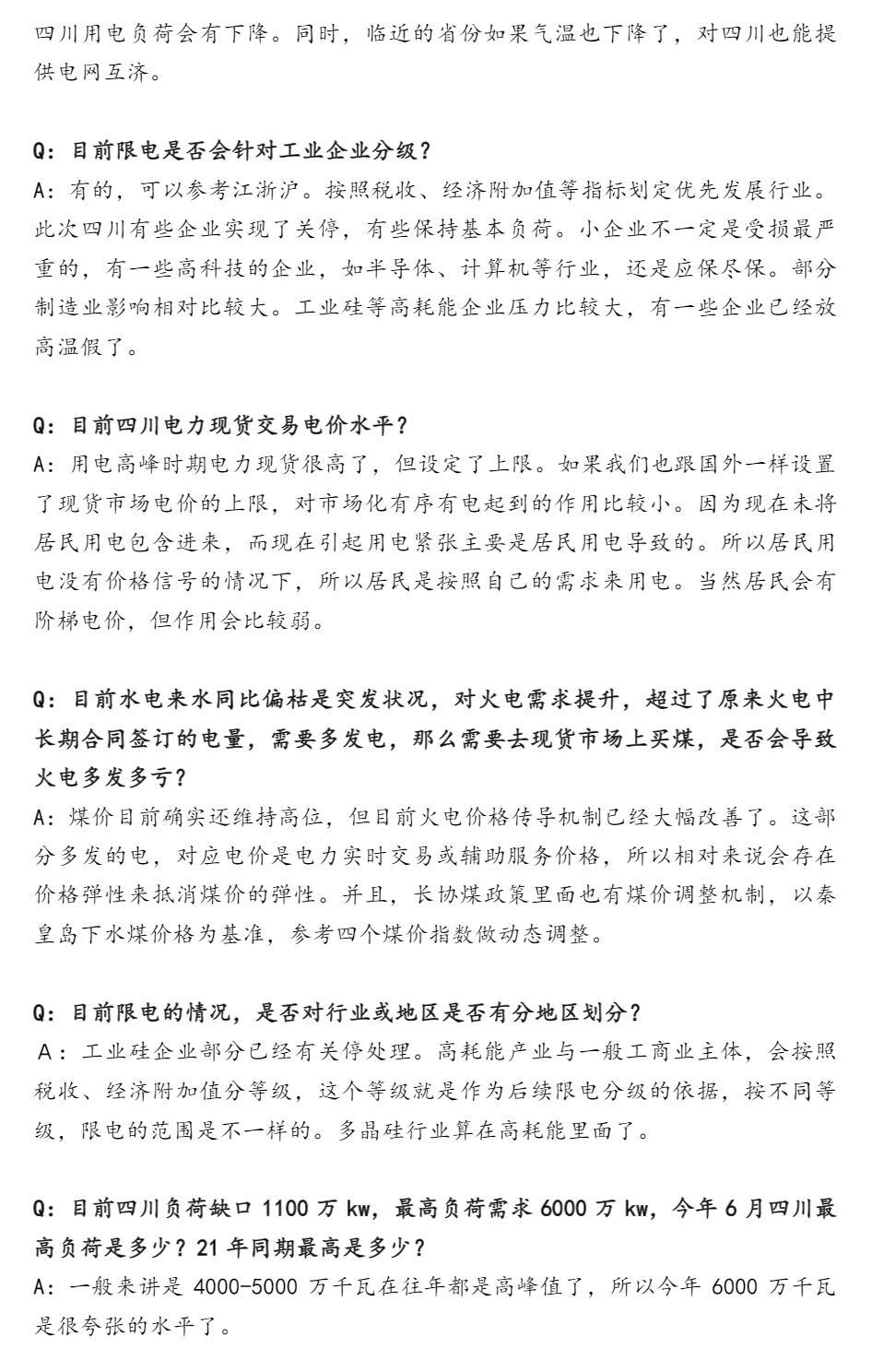 Q:四川限电情况和国网南网区域内限电情况? A:四川重庆限电比较严重,有些地方甚至下达了红头文件进行限电,对一些企业的运营影响很大,有些企业可能都停工了,首先看一下天气原因,今年很多地方遇到了几十年难遇的高温极端天气,这样天气带来的影响,不是光伏发电发的多了,有时候温度越高,光伏发电反而越少,直接影响的是居民用电量极大的增加。