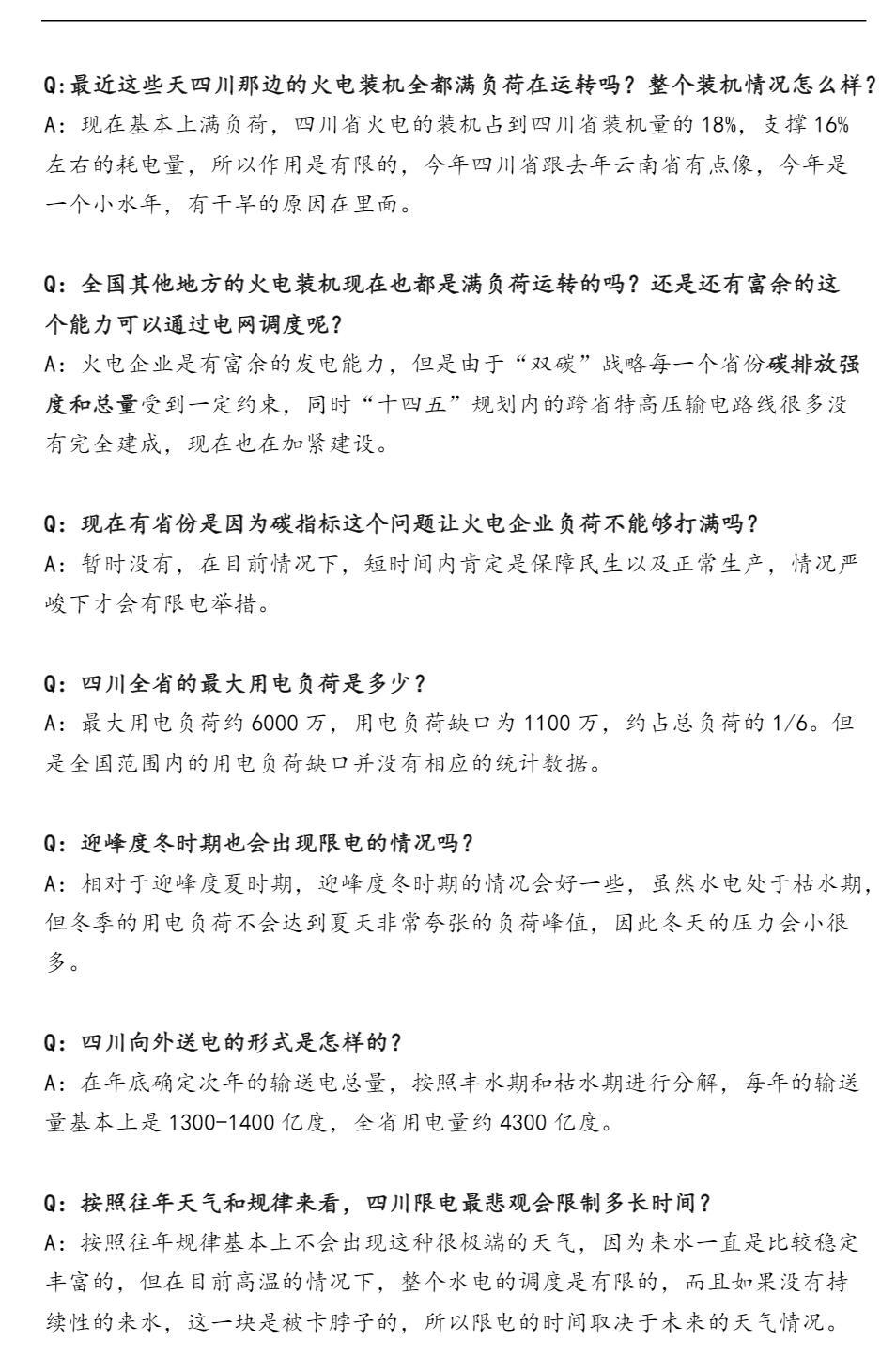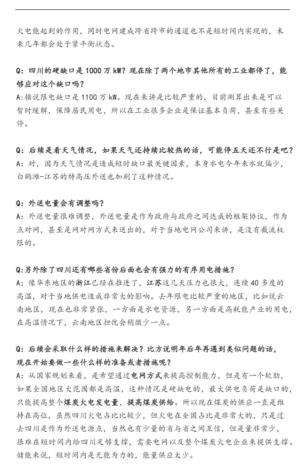 前段时间全国要求严禁电网自然治理。对于居民用户不限电,工商业的用电可能受到一定的限制,高温天气是非常重要的诱因,今年四川的水面不是很乐观,因为今年的降水较往年降低了 4 成。同时外省的煤电仍然是偏紧的。另外很重要的一点是四川省能源结构,四川省整个来讲,水力发电占了大头,水电装机占到 78%,提供了超过 80%的发电量,火电仅仅占到了 16%的装机容量。所以即便是煤炭供应起来,水电如果跟不上的话,起到的效果是有限的。另外一块,四川省水电的外送连续几年都保持在高位,并且我国家规划的外送路线很多。第五条的出川特高压线路也建成了,现在每一年实际的外送电量都超过了 1,300 亿 kWh。四川省每一年发电量 4300 亿 kWh,有接近三分之一要送出去,而且是优先要送出去,不是说本省没有电用了,就先供给自己,这是省政府与省政府之间达成的调度,从某种意义上来讲也缓解了华东地区限电情况进一步加剧,今年目前最大的用电负荷是超过了 6000 万 kW,是非常非常大的,本身用电缺口据说是有 1000 万 kW,所以四川省限电措施是比较严厉的,这个是目前的一个情况。