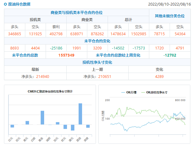 能源类持仓:截至8月16日当周,投机者所持NYMEX WTI原油净多头头寸减少13379手合约至153403手合约,创最近两年新低。投机者所持布伦特和WTI原油净多头头寸减少28979手合约至290388手合约,创最近逾两年新低。