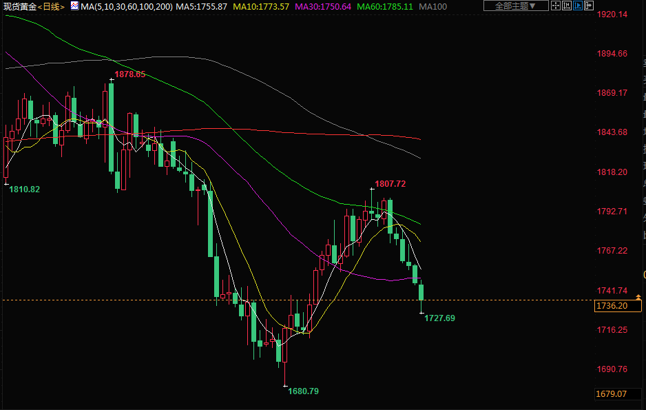 道明证券(TD Securities)大宗商品策略师Daniel Ghali表示,黄金因美元和市场预期而承压,市场预计美联储主席鲍威尔本周晚些时候在怀俄明州杰克森霍尔央行会议上发表讲话时会强化联储的鹰派立场。 在杰克森霍尔会议之后,金价可能跌至1700美元以下。