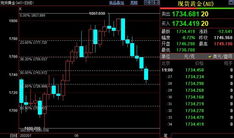 北京时间19:47,现货黄金下跌0.87%至1732.38美元/盎司;COMEX期金主力合约下跌1.01%至1745.1美元/盎司;美元指数上浮0.27%至108.391,创7月15日以来新高108.497。
