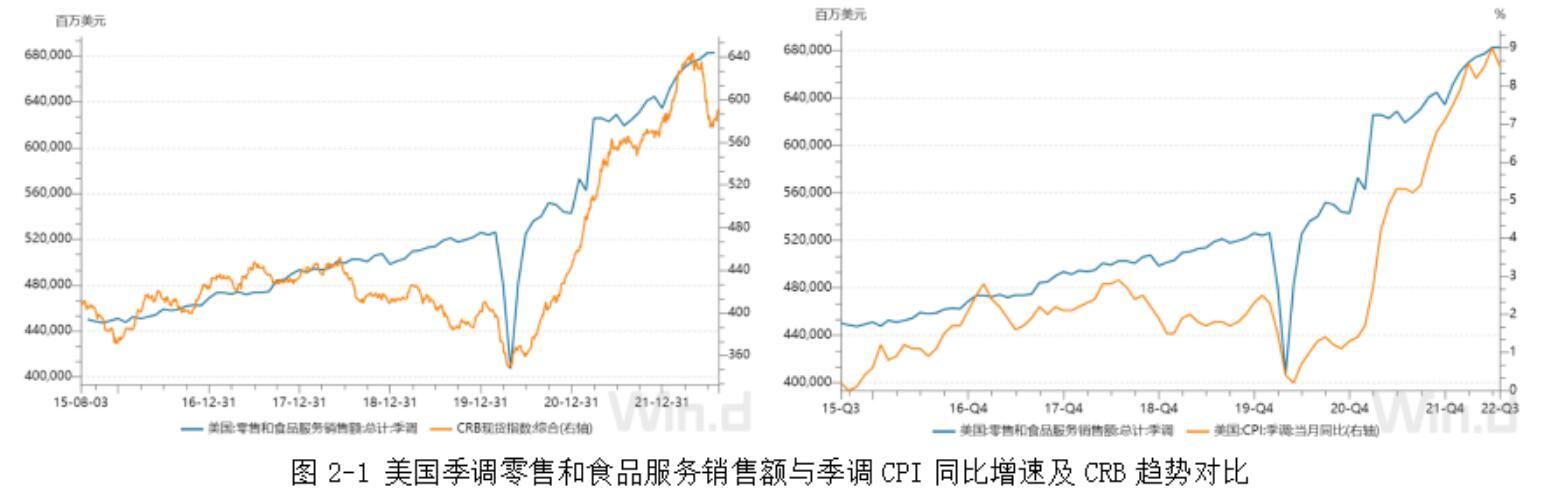 其一,美国零售项目更多统计的是生活必需品,反映的是刚性需求,所以消费总额上升更多地与物价高企有关。美国季调零售和食品服务消费总额与CRB现货综合指数和CPI同比增速走势非常贴近,并且物价走势略微更显前瞻性。当前美国通胀拐点已现,美国7月季调CPI同比增速录得8.5%,大幅低于前值9%;CRB综合现货指数更是在5月4日就触底回落。