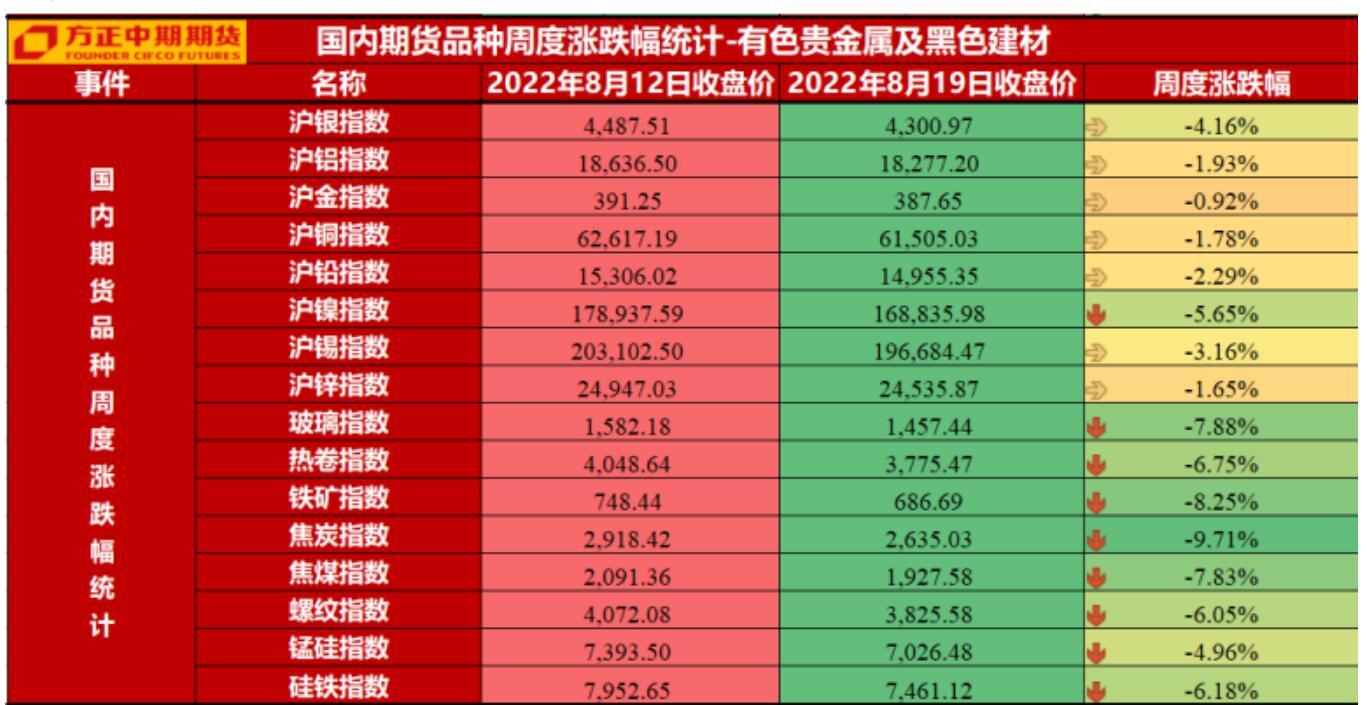 有色金属板块:本周有色金属重心下移,略有分化。美国加息节奏变化继续影响市场,美联储会议纪要解读虽偏鸽派,但近期联储官员仍在强调进一步加息的必要性,美元指数近期震荡波动升至一个月高点附近,有色继续承压。欧洲能源问题,对锌铝生产形成较大影响一度引发剧烈波动,但后续有色还是会关注对于需求预期的变化。铜:从基本面来看,国内因电力紧张多地下发限电通知,包括华东和四川等地,对上下游均有一定影响,从SMM的调研来看对上游冶炼的影响要更严重,不过与过去能耗双控下的限电不同,此轮限电的原因是异常高温导致多地电力负荷过高所致,相信未来随着气温的下降,限电情况将有所好转,预计对基本面的影响将小于去年。考虑到宏观因素近期有转弱的风险,且目前基本面支撑也较弱,可考虑轻仓试空,期权卖出虚值看涨。锌:欧洲的能源危机已经对锌供应构成重大威胁,在欧洲的其他冶炼厂几乎没有实现盈利。欧洲地区冶炼产能占比约全球的18%,目前有约一半的产能仍处于错峰生产的状态,如果进一步减产则将对供应造成重大影响。预计供应压力仍是驱动未来锌价可能上行的主要原因,操作上以回调买入为主,注意控制仓位严格止损,期权可考虑买入虚值期权对风险敞口行情进行保护。铝:供给端,目前国内供给端受高温限电的影响,产能有所减少。欧洲产能也因能源问题再度削减。需求方面,随着淡季的持续以及外部环境的恶化,加工行业订单情况较为疲软,且终端消费的复苏还需要时间以及更多刺激措施。库存方面,社会库存有所去化支撑铝价。目前沪铝盘面受限电等事件影响波动较大,建议单边投机回避,空近月多远月的跨期套利组合可继续持有,需关注限电事态的进一步发展,短期盘面利多因素较多。08合约上方压力位20000,下方支撑位17000。镍:本周调整,电解镍7-8月持续环比增产,国内期货库存一度增至3000吨上方,电解镍供应改善,现货升水回落。LME镍继续降库存至历史新低,低库存仍易引发高波动。从需求端来看,不锈钢供需双弱,8月排产总体下降,近期继续有减产发生,但因印尼资源回流社库回升。新能源汽车产业继续向好发展,三元材料对硫酸镍需求仍将回升,国内限电措施对下游影响超过上游。镍价近期围绕17万元波动,而整体仍在16-18.5万元间宽幅震荡。锡:供给方面,国内锡冶炼厂复产产能开始逐步投放市场。需求方面,不同行业表现差异较大,光伏行业保持高增速,锡焊料企业开工依然维持低位。库存方面,上期所库存有所减少,LME库存维持高位,smm社会库存环比去库。目前现货成交也相对清淡,客户对高价接受度较低。锡在180000-20000元间震荡为主。铅:震荡延续,供应端,原生铅供应稳中有增,冶炼厂库存维持增加态势,冶炼厂出货积极性不高,报价略显坚挺,散单出货量有限;再生铅产能依旧过剩,炼厂库存较高,再生铅供应量充足;消费端,在消费恢复不及预期的情况下,前期大型铅蓄电池企业满产导致铅蓄电池库存较高,近日受限电影响开工率有所下滑,因此铅锭采购能力偏弱。库存因交割出库显著回升。近期铅料会延续震荡走势,铅2209合约回到震荡区14700-15300以内震荡。