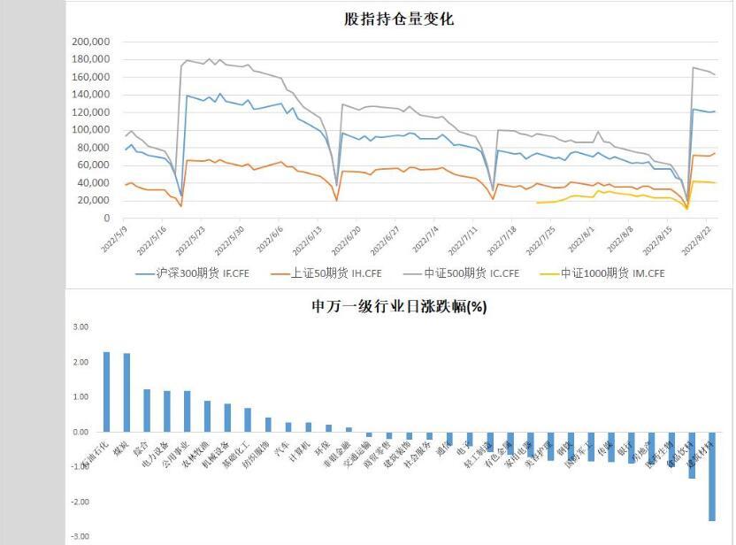 2、受到隔夜外盘指数集体下挫以及激进加息预期升温的影响,今日三大指数集体低开,随后走势分化,创业板指全天小幅收涨,沪指和深证成指震荡回调,市场情绪逐渐谨慎。北向资金受到外盘情绪以及人民币汇率走软的影响,全天大幅净流出,经济衰退的担忧再次加剧,两市成交额勉强维持在万亿上方。隔夜美股创两个月内最大跌幅,利率敏感板块领跌美股市场。衡量欧元区长期市场通胀预期的一个关键指标升至2.207%,至两个多月以来最高。欧洲能源危机愈演愈烈,高通胀逐渐变得根深蒂固,欧元兑美元跌破平价位。韩国8月出口接近停滞,预告着全球经济衰退正在逐渐逼近。避险情绪升温,美元指数升至五周新高。欧美央行持续向市场释放鹰派信号,显著压低市场风险偏好,鲍威尔发表讲话前,市场预期鲍威尔的讲话将比7月会议纪要更加鹰派,十年期美债收益率自7月21日以来首次升破3%,两年/10年期收益率曲线倒挂走阔至28.9个基点,表明市场对衰退降至的押注增加。而货币市场对9月美联储加息75个基点的概率提升至了54.5%,较之前明显上升。受到海外激进加息预期升温以及经济衰退担忧再次加剧的影响,隔夜欧美股市大幅下挫,北向资金全天大幅净流出超90亿,对A股市场产生情绪面冲击。光伏、新能源等赛道板块在国内MLF和LPR降息的操作下相对保持强势并对盘面形成支撑,海外能源危机愈加严重同时国内限电冲击下,能源股行情得到催化。短期来看,市场仍处于盈利弱修复的阶段股指维持震荡。申万一级31个行业中13个行业上涨,其中石油石化和煤炭行业领涨,建筑材料行业领跌。