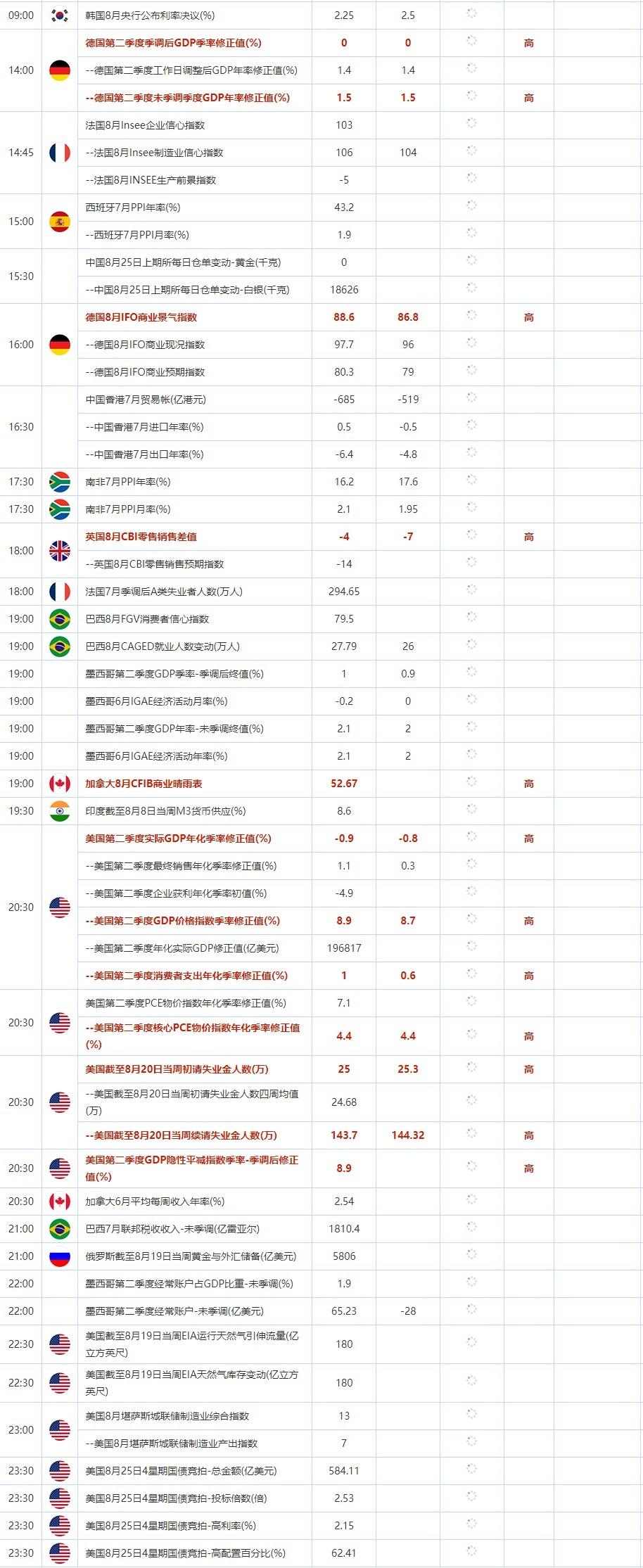 09:00 韩国8月央行公布利率决议(%) , 前值 2.25 , 预期值 2.5 , 公布值:待发布