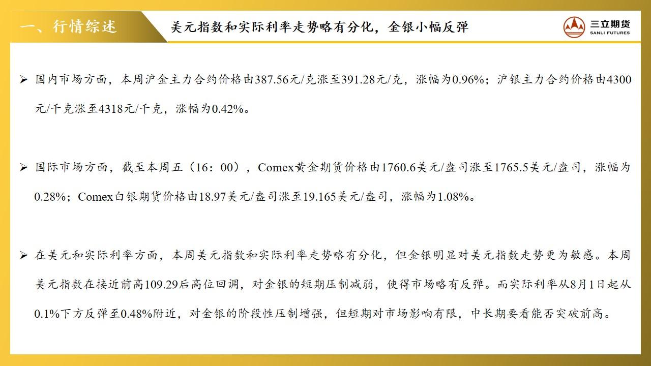 三立期货贵金属周报:全球央行年会来袭,鲍威尔讲话影响金银节奏 2022-08-26 18:04 全球央行年会来袭,鲍威尔讲话影响金银节奏。三立期货公司授权文本由“专注期货开户交易及专业行情分析资讯网站”:【一期货 www.1qh.cn】转发