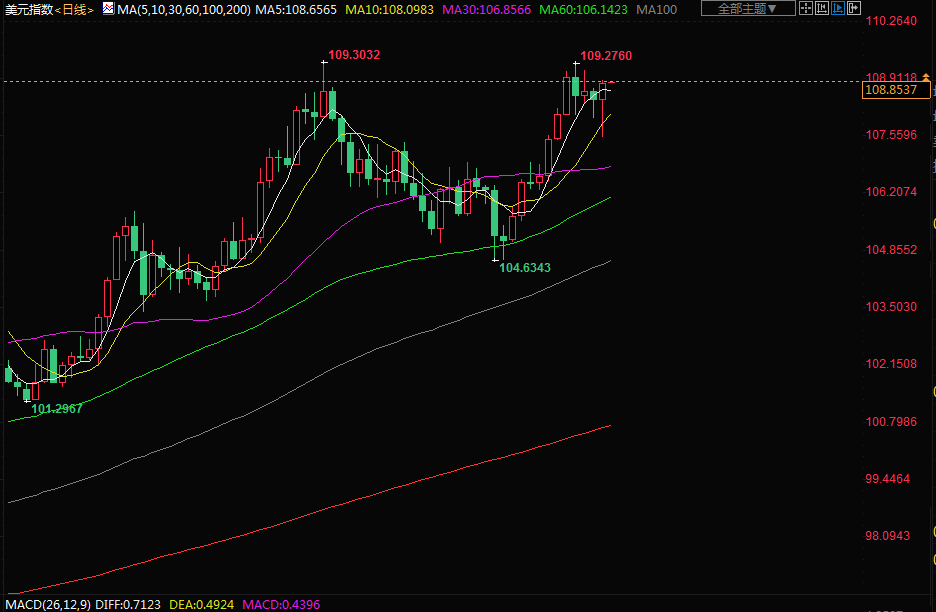 美元指数升至108.78,日内上涨0.30%,稍早低见107.54。美元指数从上周二触及五周高点109.27回落,并保持在7月14日触及的20年高点109.29以下。