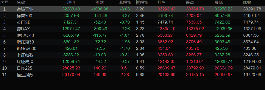 美股收盘情况,标普500指数大跌3.37%,收报4057.66点;纳斯达克指数重挫3.94%,收报12141.71。道琼斯工业指数下跌3.03%,收报32283.40点。