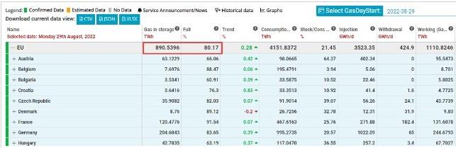 欧盟国家目前储存的天然气约为890.5太瓦时(TWh),已经超过了去年冬天之前858太瓦时的库存峰值。