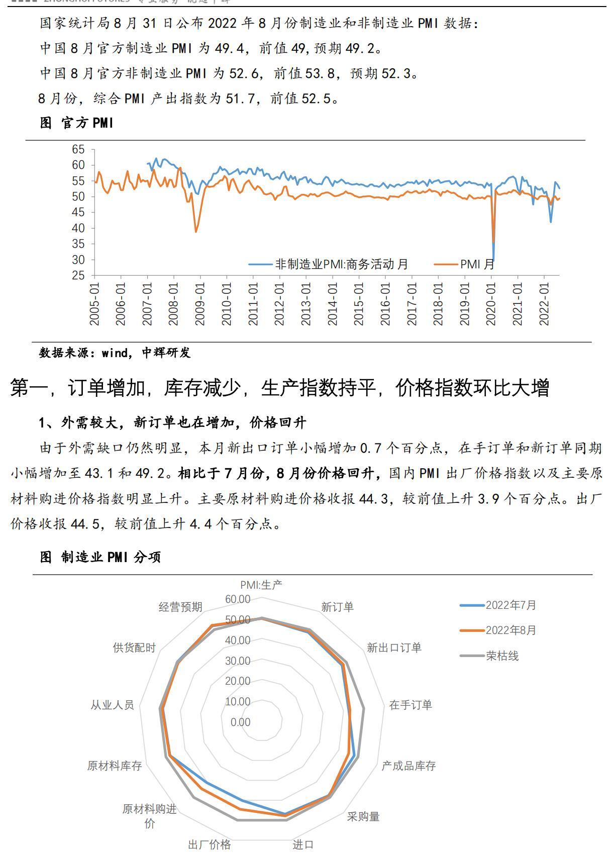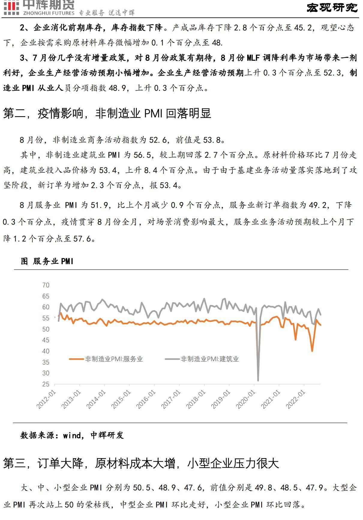 第一,外需较大,库存减少,8 月份 PMI 微幅好转 订单指数增加,包括进口订单和外需订单都有小幅的增加,说明外需缺口仍然明显,8 月份有增量政策出台,活动量相对积极,其他订单也有小幅增加。同时相比于 7 月份大宗商品价格走高,8 月份价格指数上升。但是由于市场消化前期的库存,本月库存指数下滑。8月份的生产经营活动预期微幅增加。
