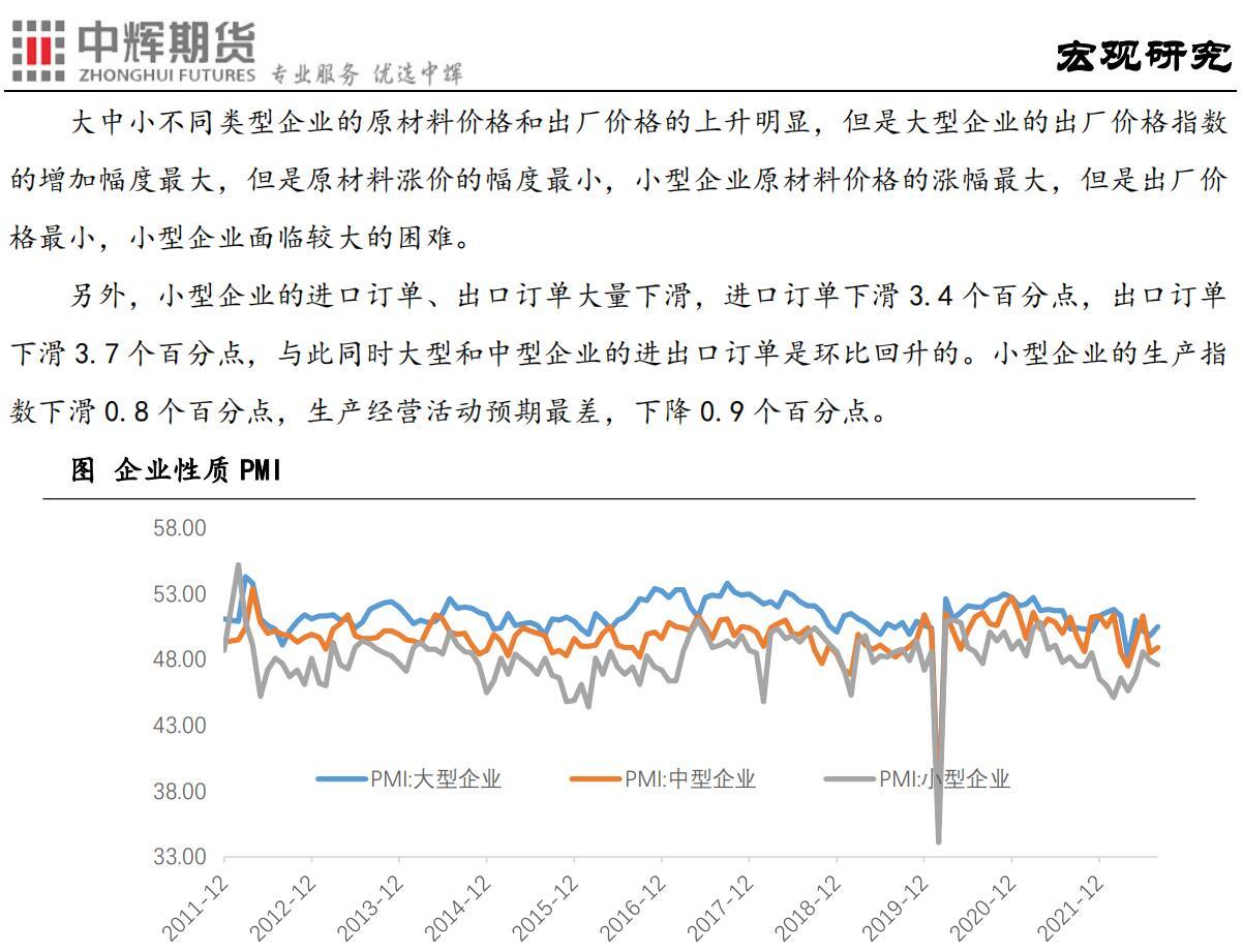 第三,订单大降,原材料成本大增,小型企业仍然困难小企业的成产成本绝对值和增幅都是最大,同时小企业的出厂价格最低,另外小型企业的进口订单和出口订单都是大幅度减少,与此同时大型和中型企业的进出口订单是环比回升的。小型企业的生产指数下滑 0.8 个百分点,生产经营活动预期最差,下降 0.9 个百分点。