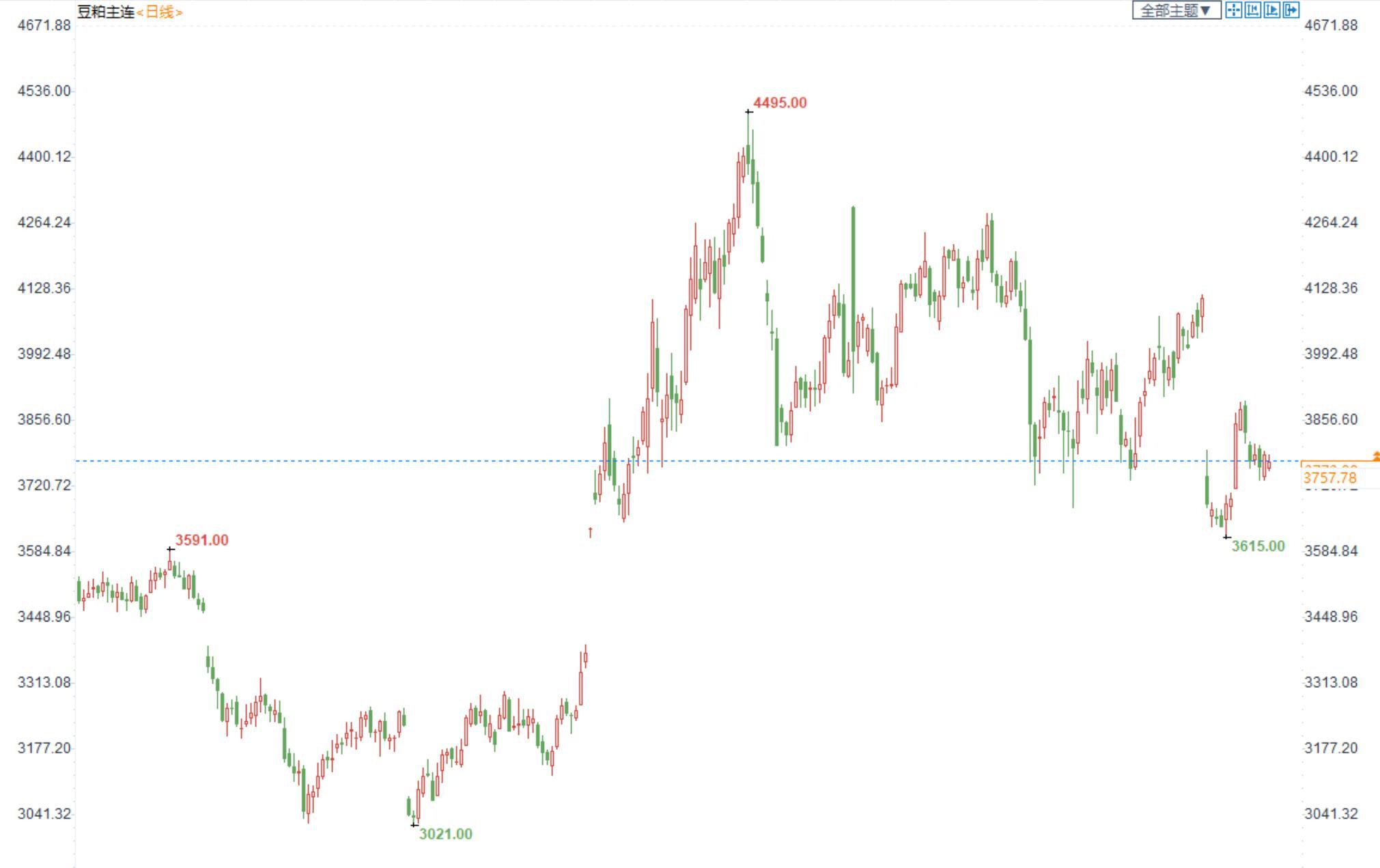 豆粕2301合约日内跌0.42%,收盘价3773元/吨,现货张家港43%蛋白豆粕4390元/吨。