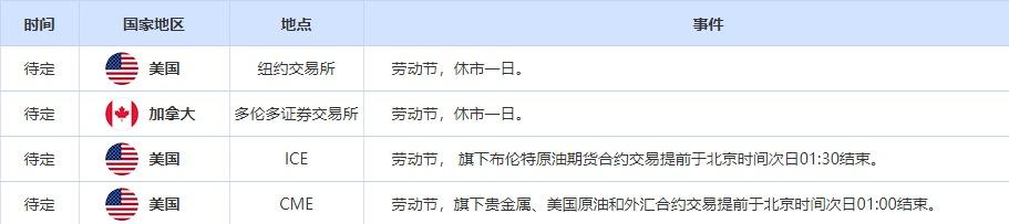 另外值得投资者注意的是,9月5日,因劳动节,加拿大多伦多证券交易所和美国纽约交易所休市一日。美国ICE旗下布伦特原油期货合约交易提前于北京时间次日01:30结束,美国CME,旗下贵金属、美国原油和外汇合约交易提前于北京时间次日01:00结束。