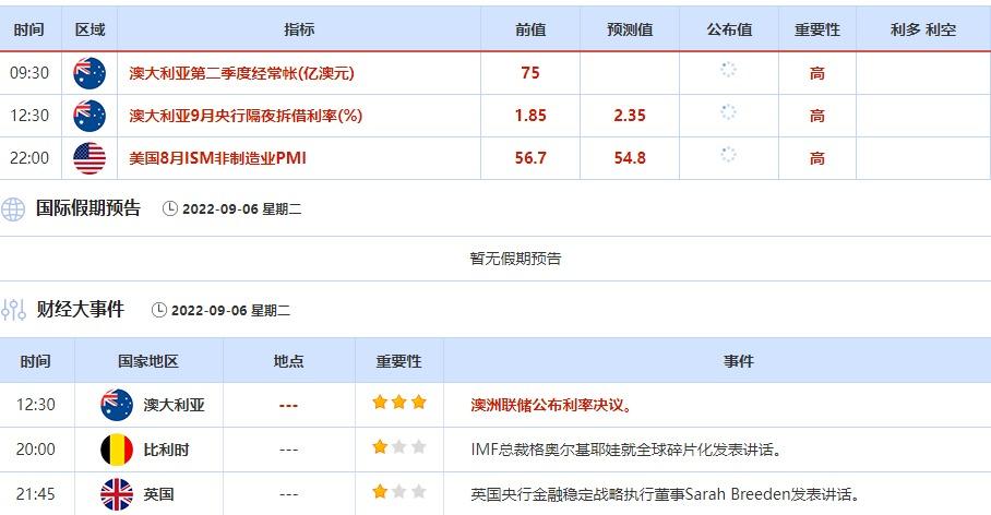 ②9月6日(周二)关键字:澳洲联储利率决议,美国8月ISM非制造业PMI