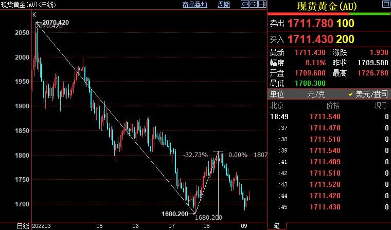北京时间19:50,现货黄金上涨0.20%至1711.85美元/盎司;COMEX期金主力合约上浮0.01%至1722.7美元/盎司;美元指数上涨0.14%至109.967。