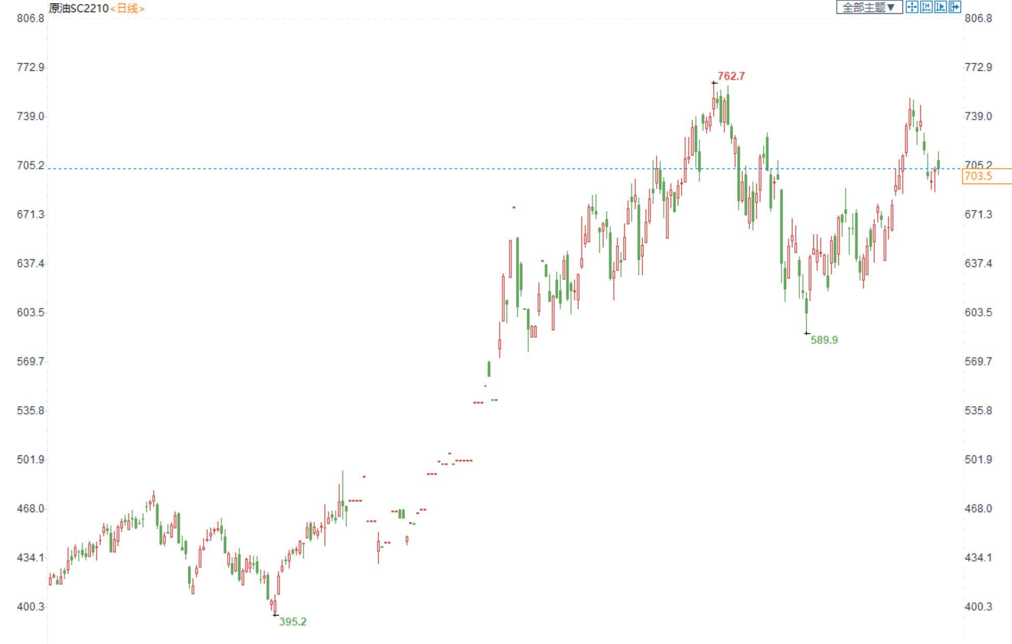 期货市场,布油目前在92美元附近震荡整理,国内SC2210合约收盘价703.5,小幅收跌。