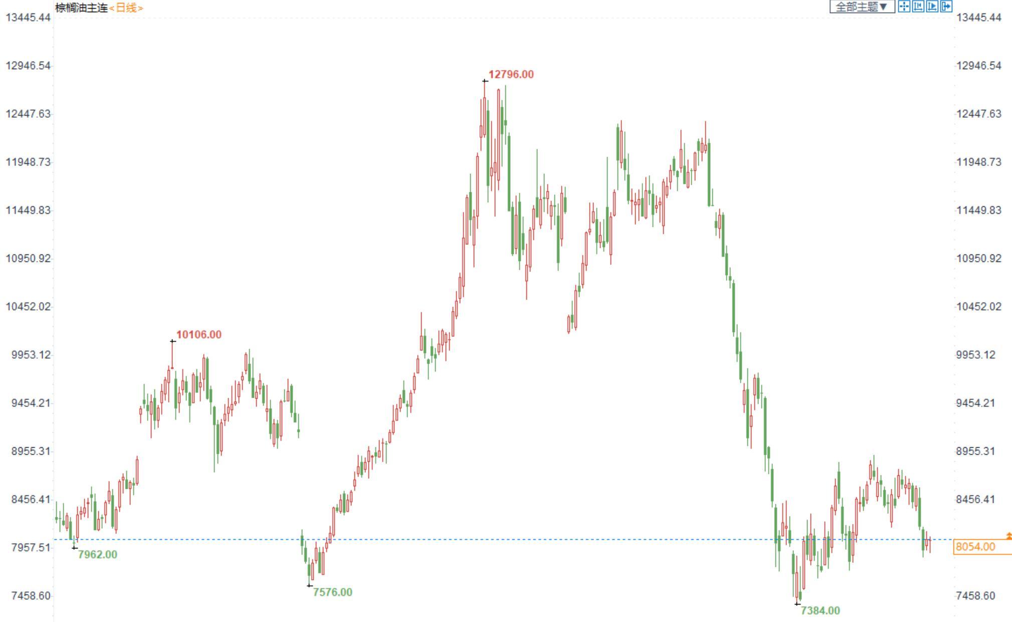 棕榈油2301合约日内跌0.12%,收盘8054元/吨;广州市场棕榈油8540元/吨。
