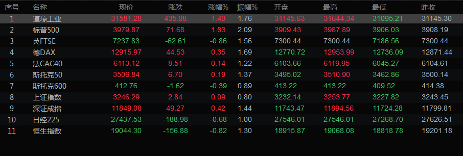 美股收盘情况:道琼斯工业指数上涨1.4%,至31581.28点;标普500指数上涨1.83%,至3,979.87点;纳斯达克指数上涨2.14%,至11791.90点。