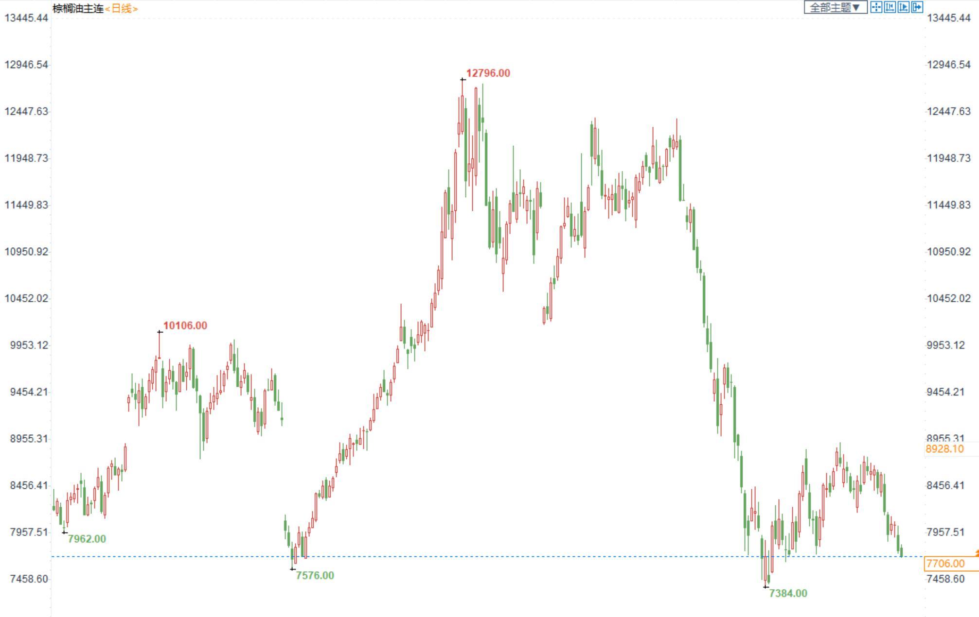 棕榈油2301合约日内跌0.87%,收盘7706元/吨;广州市场棕榈油8280元/吨。