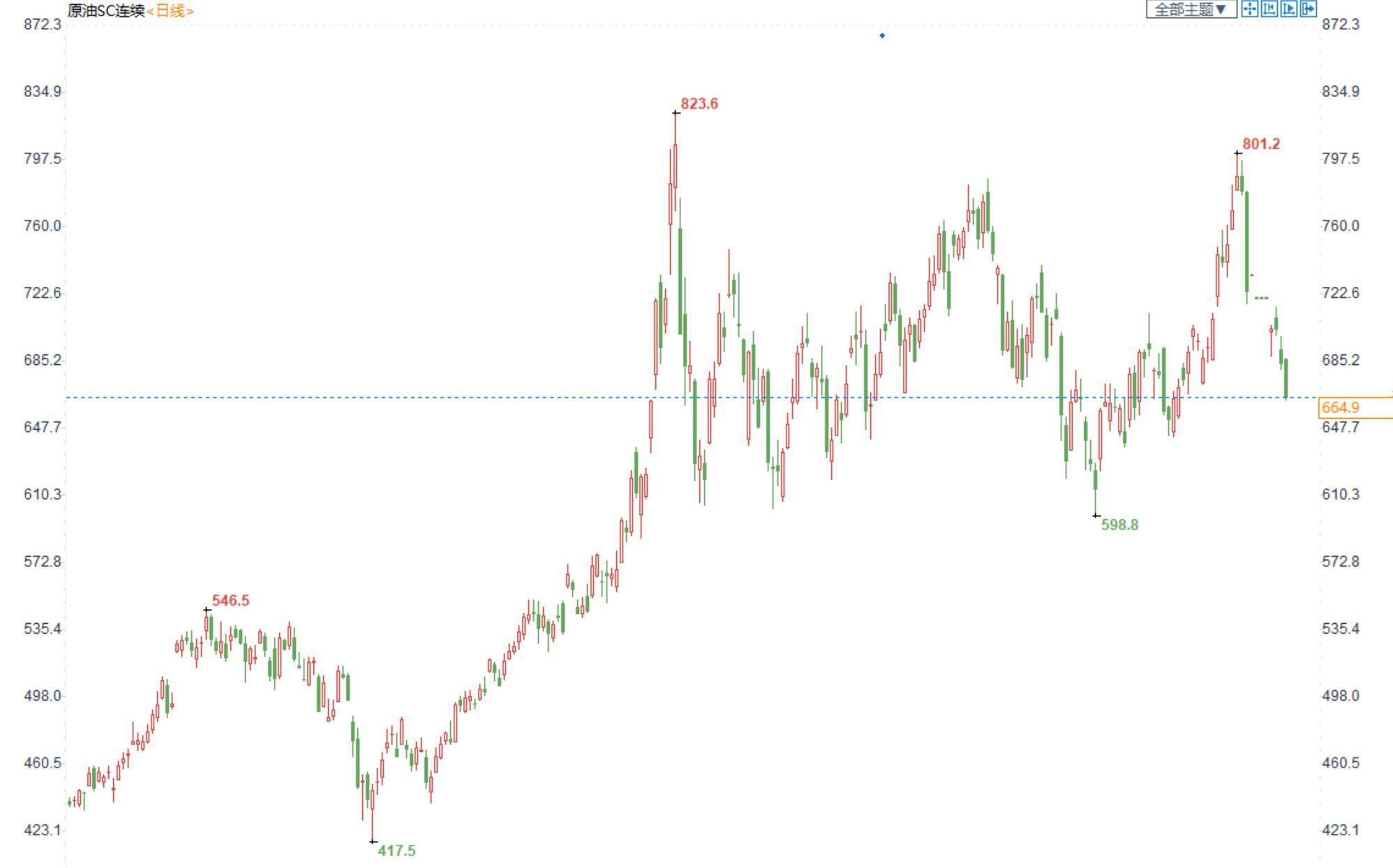 期货市场,布油目前在88美元附近震荡整理,国内SC2210合约收盘价664.9,跌超2%。
