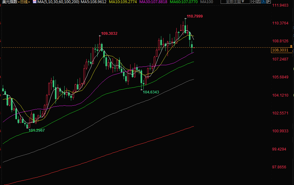 由于对美联储激进行动的预期,美元指数一直在走强,并在上周三达到了110.79的20年峰值。周一,该指数当日下跌0.4%,报108.31,盘中曾触及8月26日以来的最低点。
