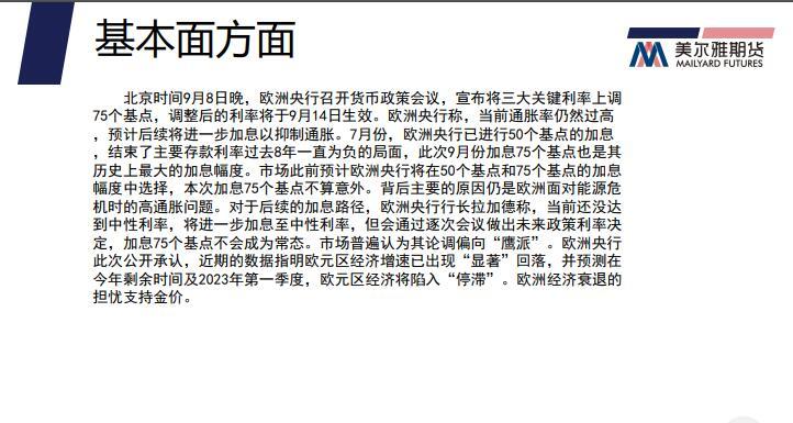 北京时间9月8日晚,欧洲央行召开货币政策会议,宣布将三大关键利率上调75个基点,调整后的利率将于9月14日生效。欧洲央行称,当前通胀率仍然过高,预计后续将进一步加息以抑制通胀。7月份,欧洲央行已进行50个基点的加息,结束了主要存款利率过去8年一直为负的局面,此次9月份加息75个基点也是其历史上最大的加息幅度。市场此前预计欧洲央行将在50个基点和75个基点的加息幅度中选择,本次加息75个基点不算意外。背后主要的原因仍是欧洲面对能源危机时的高通胀问题。对于后续的加息路径,欧洲央行行长拉加德称,当前还没达到中性利率,将进一步加息至中性利率,但会通过逐次会议做出未来政策利率决定,加息75个基点不会成为常态。市场普遍认为其论调偏向“鹰派”。欧洲央行此次公开承认,近期的数据指明欧元区经济增速已出现“显著”回落,并预测在今年剩余时间及2023年第一季度,欧元区经济将陷入“停滞”。欧洲经济衰退的担忧支持金价。