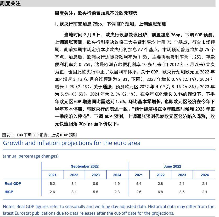 第一,9 月欧央行前置加息 75bp,下调 GDP 增速预测、上调 HICP 预测,欧元区将在今年晚些时候陷入滞涨;