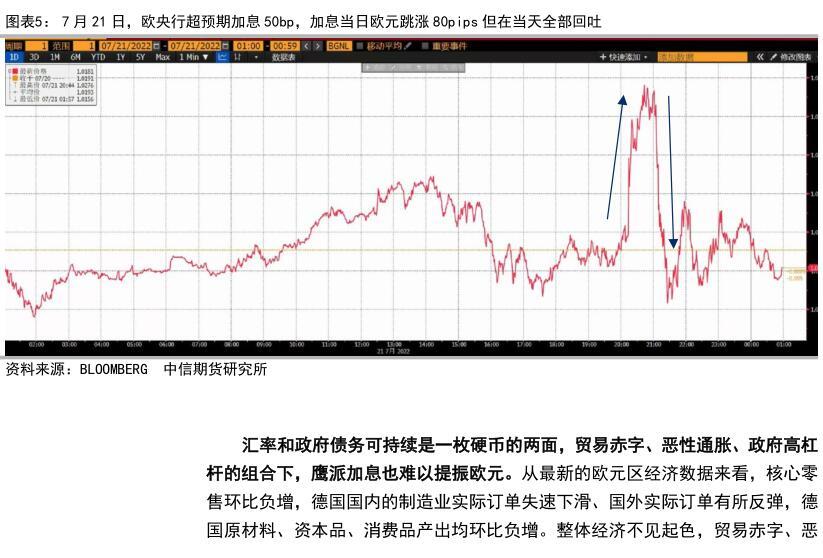 第三,7 月欧央行超预期加息 50bp 有一定的坐标意义:加息当日欧元跳涨 80pips 但在当天全部回吐,之后以 1.02 为中枢波动至 8 月 12 日,随后再次下行,并于 8 月 22 日跌破平价,也即超预期加息难以有效推升欧元;