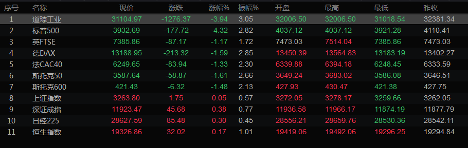 美股收盘情况:道琼斯工业指数下跌3.94%,至31104.97点;标普500指数下跌4.32%,至3932.69点;纳斯达克指数下跌5.16%,至11633.57点。