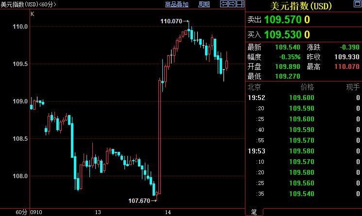 北京时间19:53,现货黄金上浮0.01%至1702.12美元/盎司;COMEX期金主力合约下跌0.29%至1712.6美元/盎司;美元指数下跌0.34%至109.553。