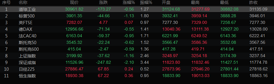 美股收盘情况:道琼斯工业指数下跌0.56%,至30961.82点;标普500指数下跌1.13%,至3901.35点;纳斯达克指数下跌1.43%,至11,552.36点。