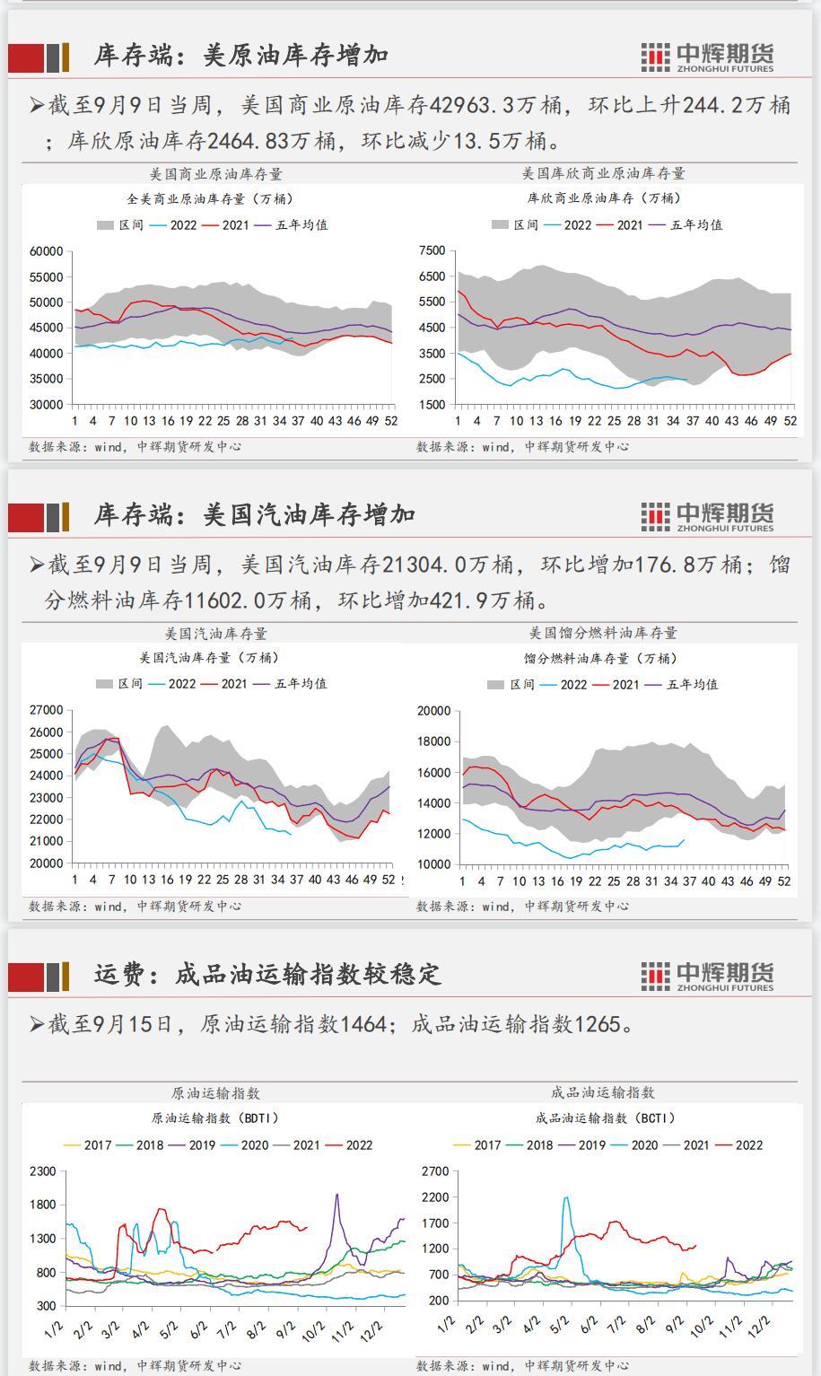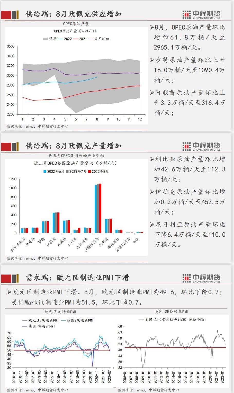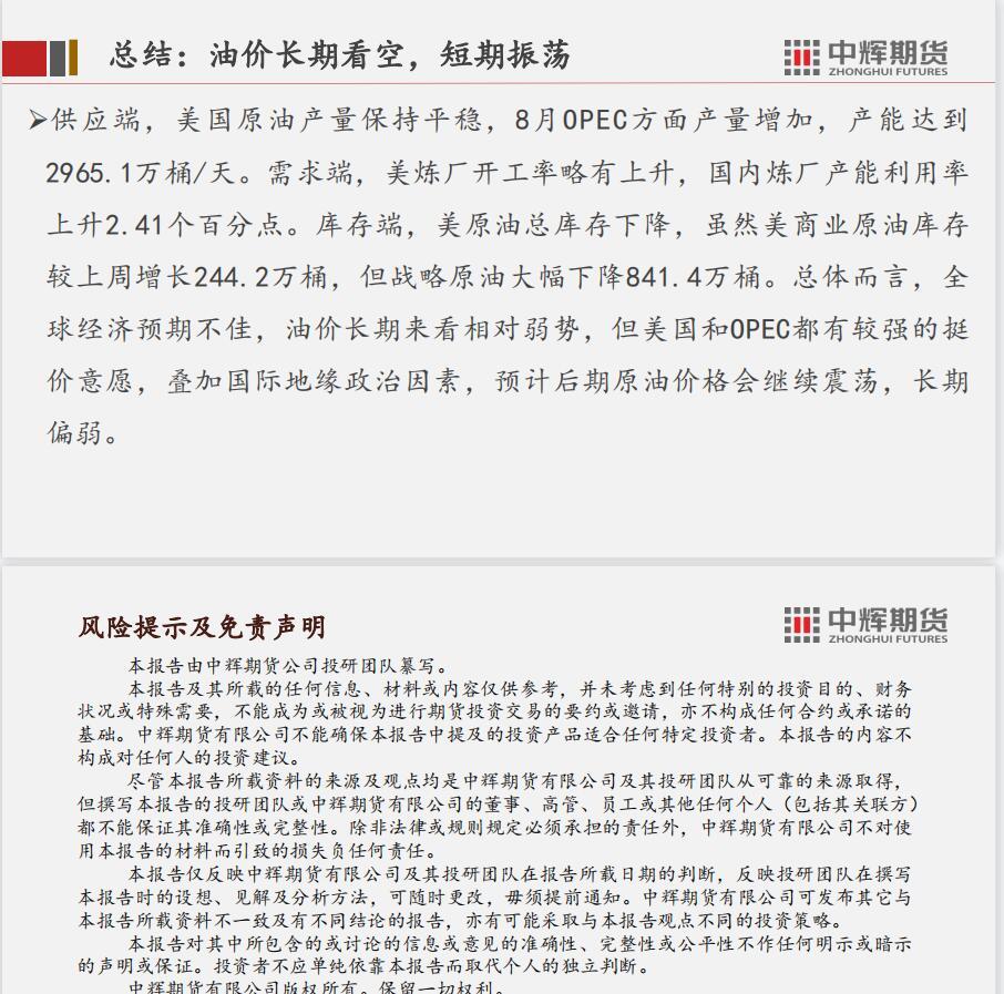 供应端,美国原油产量保持平稳,8月OPEC方面产量增加,产能达到 2965.1万桶/天。需求端,美炼厂开工率略有上升,国内炼厂产能利用率 上升2.41个百分点。库存端,美原油总库存下降,虽然美商业原油库存 较上周增长244.2万桶,但战略原油大幅下降841.4万桶。总体而言,全 球经济预期不佳,油价长期来看相对弱势,但美国和OPEC都有较强的挺 价意愿,叠加国际地缘政治因素,预计后期原油价格会继续震荡,长期偏弱。