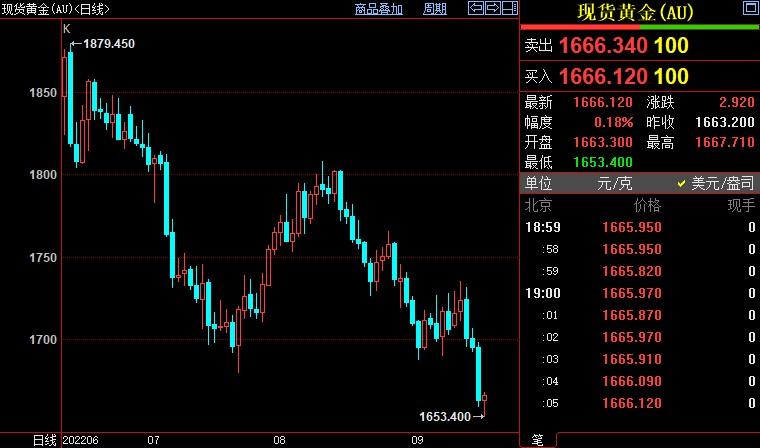 截至发稿,现货黄金累计下跌近2.93%至1665.84美元附近/盎司;美元指数累计上涨0.82%至108.879。