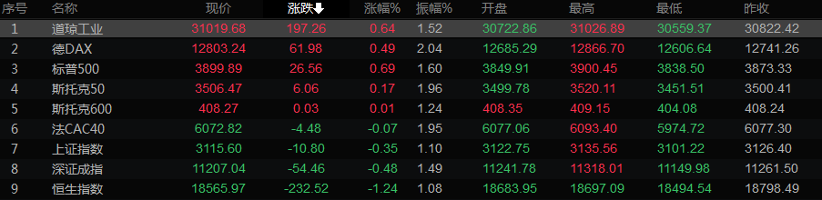 美股收盘情况:道琼斯工业指数上涨0.64%,至31019.68点;标普500指数上涨0.69%,至3899.89点;纳斯达克指数上涨0.76%,至11535.02点。
