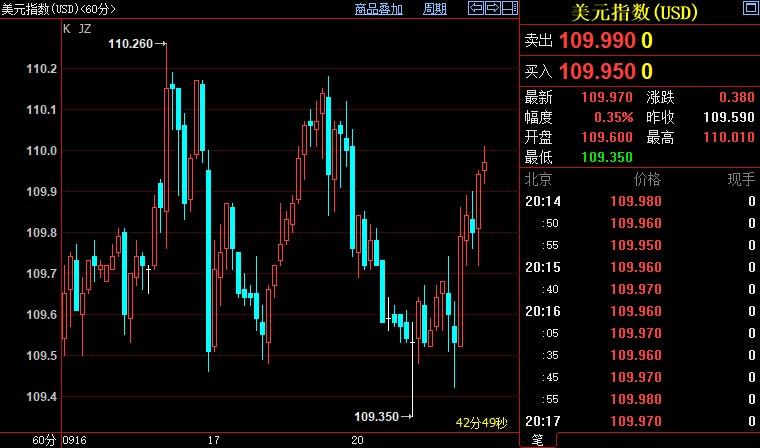 北京时间20:16,现货黄金下跌0.43%至1668.23美元/盎司;美元指数上涨0.34%至109.9768。