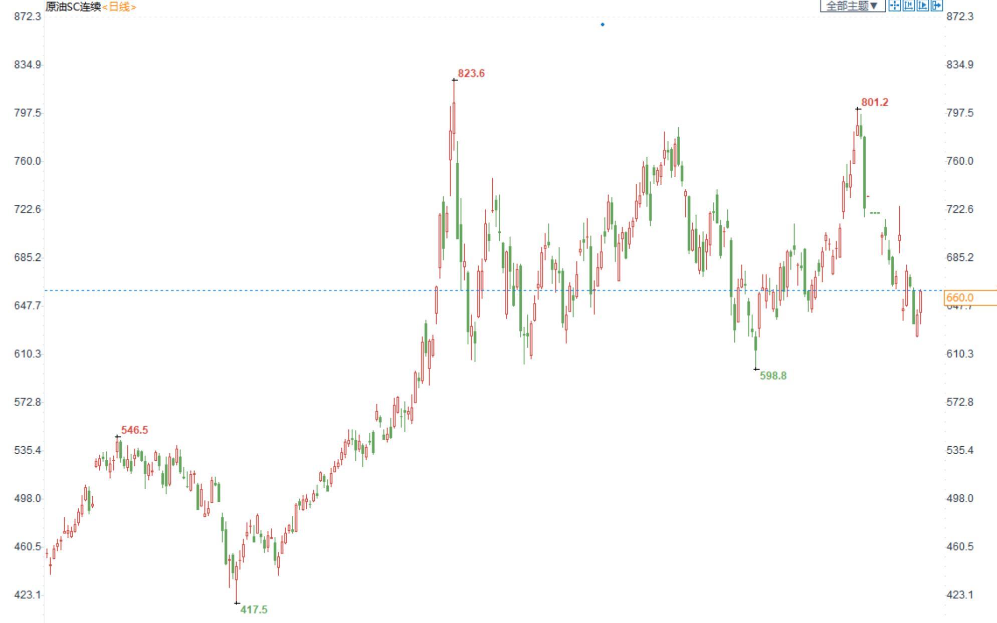 期货市场,布油在92美元整数关口震荡整理,小幅反弹;国内SC2211合约收盘价为660,小幅收涨。