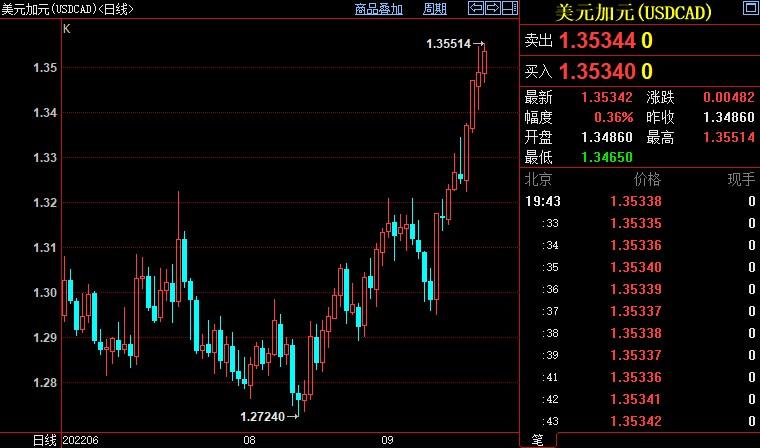 美元兑加元大涨2.10%至1.3543,创2020年7月20日以来新高至1.3550。加拿大8月份通胀年率从7月份的7.6%大幅下降至7.0%,连续第二个月大幅走低。由于家庭偿债率可能创下历史新高,若通胀见顶坐实,可能限制加拿大央行激进加息。