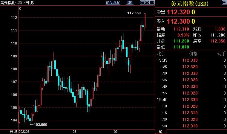本周,美元指数进一步扩大涨势,创2002年5月下旬以来新高至112.347,目前上涨2.18%至112.059。美联储如期连续第三次加息75个基点。且其他多国央行也同样大幅加息。瑞士央行如期加息75个基点,结束持续8年的负利率政策;英国央行如期加息50个基点,全球经济衰退预期强化,美元避险地位得到巩固,非美货币普遍进一步走弱。