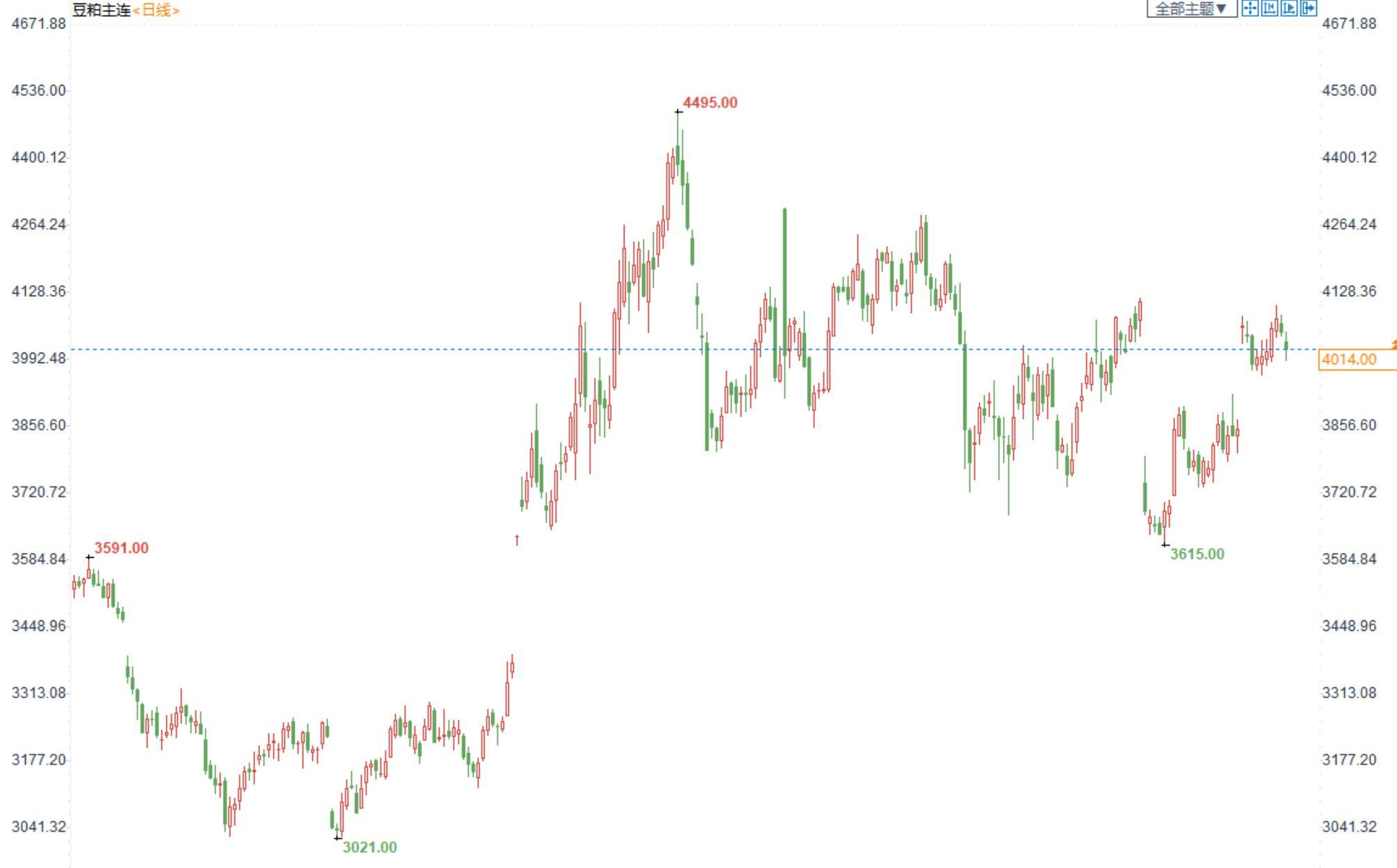 豆粕2301合约日内跌0.82%,收盘价4014元/吨,现货张家港43%蛋白豆粕5165元/吨。
